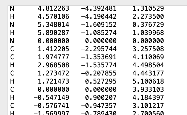 For example, the atom #1 (Nitrogen in this case) is now at the origin, and atom #2 (Carbon in this case) is now at 0,0, 3.9331Ă