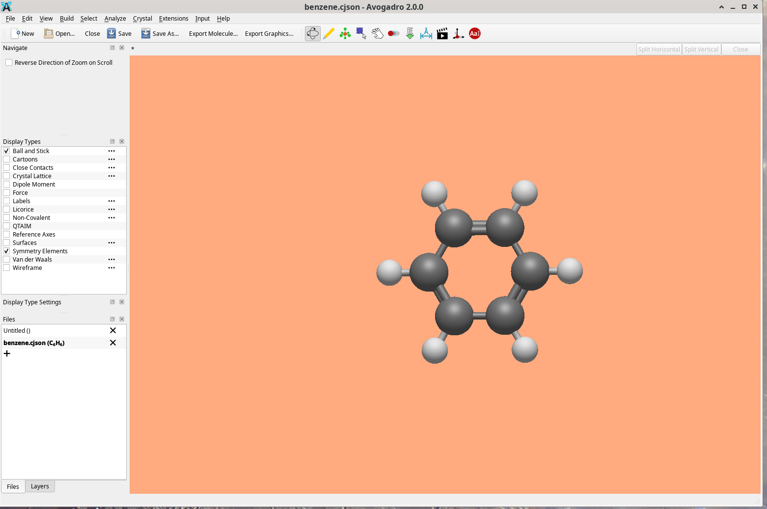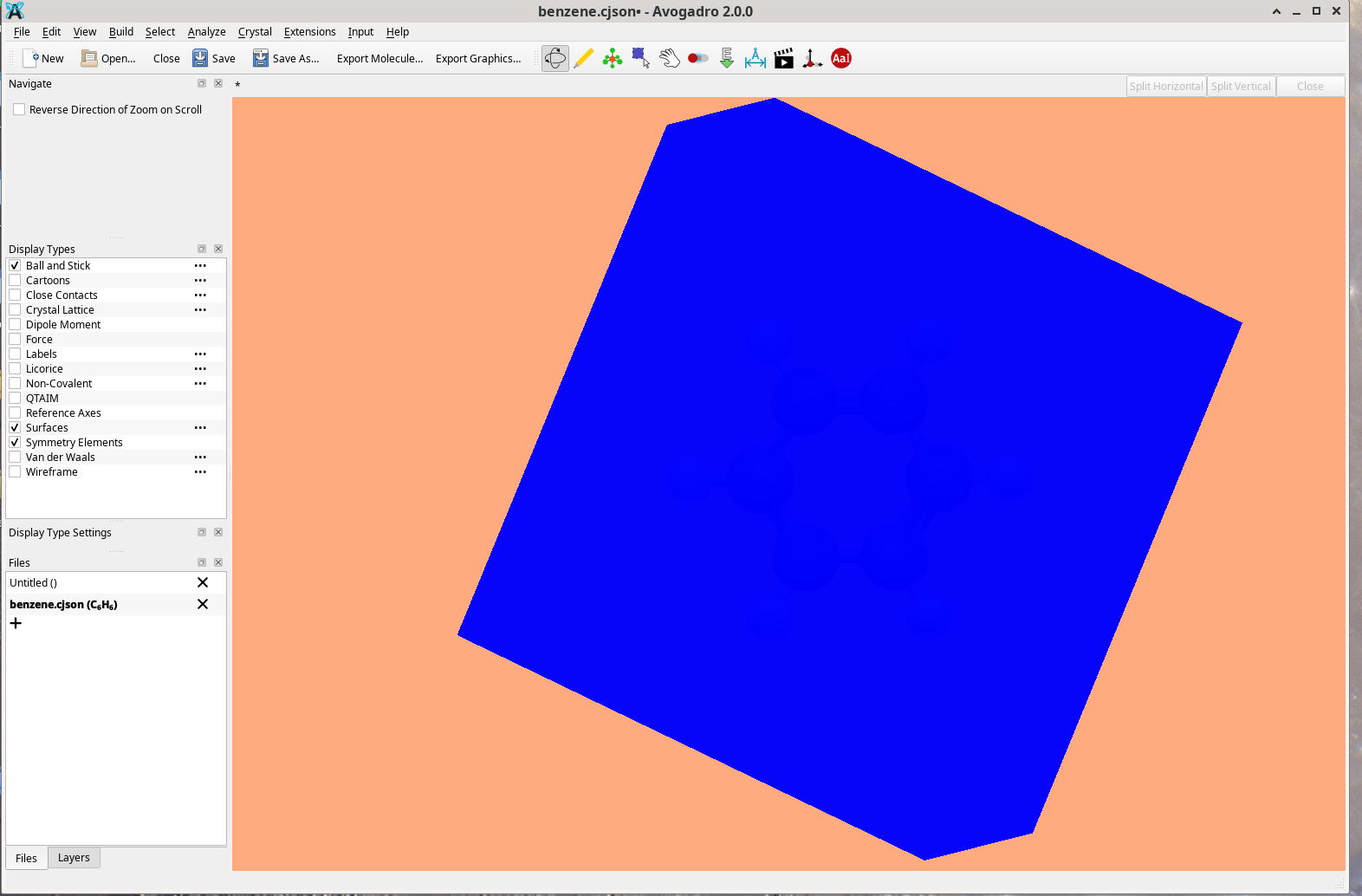 I tried it on all the surfaces (VDW, solvent included, solvent excluded, and color by ep. The blue thing varied in size (2 sizes one filled most of the screen but was the same shape as the smaller. I screenshot the smaller. I used benzene for the example, but it does this for everything I tried. Again this is for the appimage Avogadro running under Fedora linux 43
