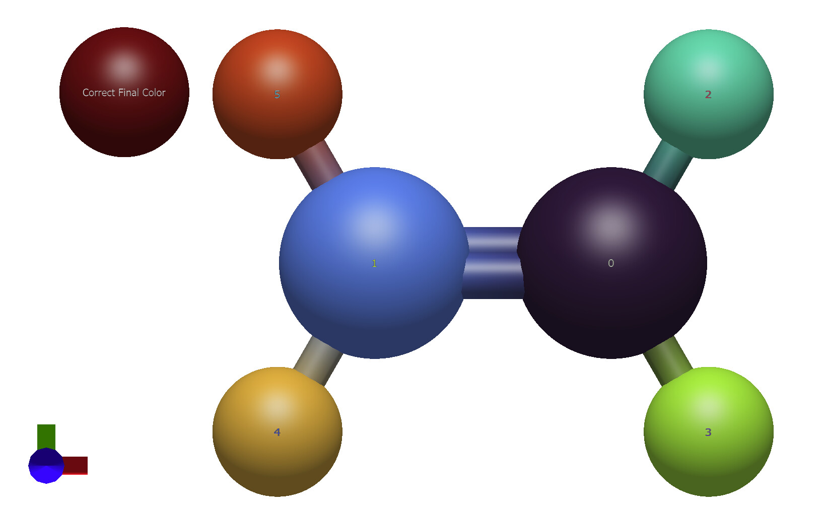 Take any collection of N atoms, color by Atomic Index, then compare the color of the last atom to the last color in the color map. Here is a picture of ethylene colored by index with the turbo colormap, along with an atom right next to the last atom with the correct final color:
