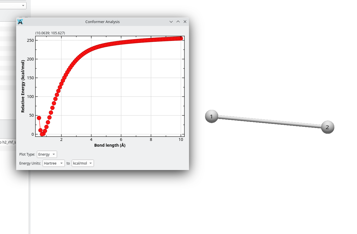 Thanks for this feature, really useful! Another improvement may be to set the X-axis value to other properties of the structure, such as a given bond/angle/dihedral (e.g., the one selected on the properties dialog when opening the conformer data dialog). This would unlock the possibility to show relaxed scans (e.g, by opening the allxyz file from an Orca relaxed scan run).