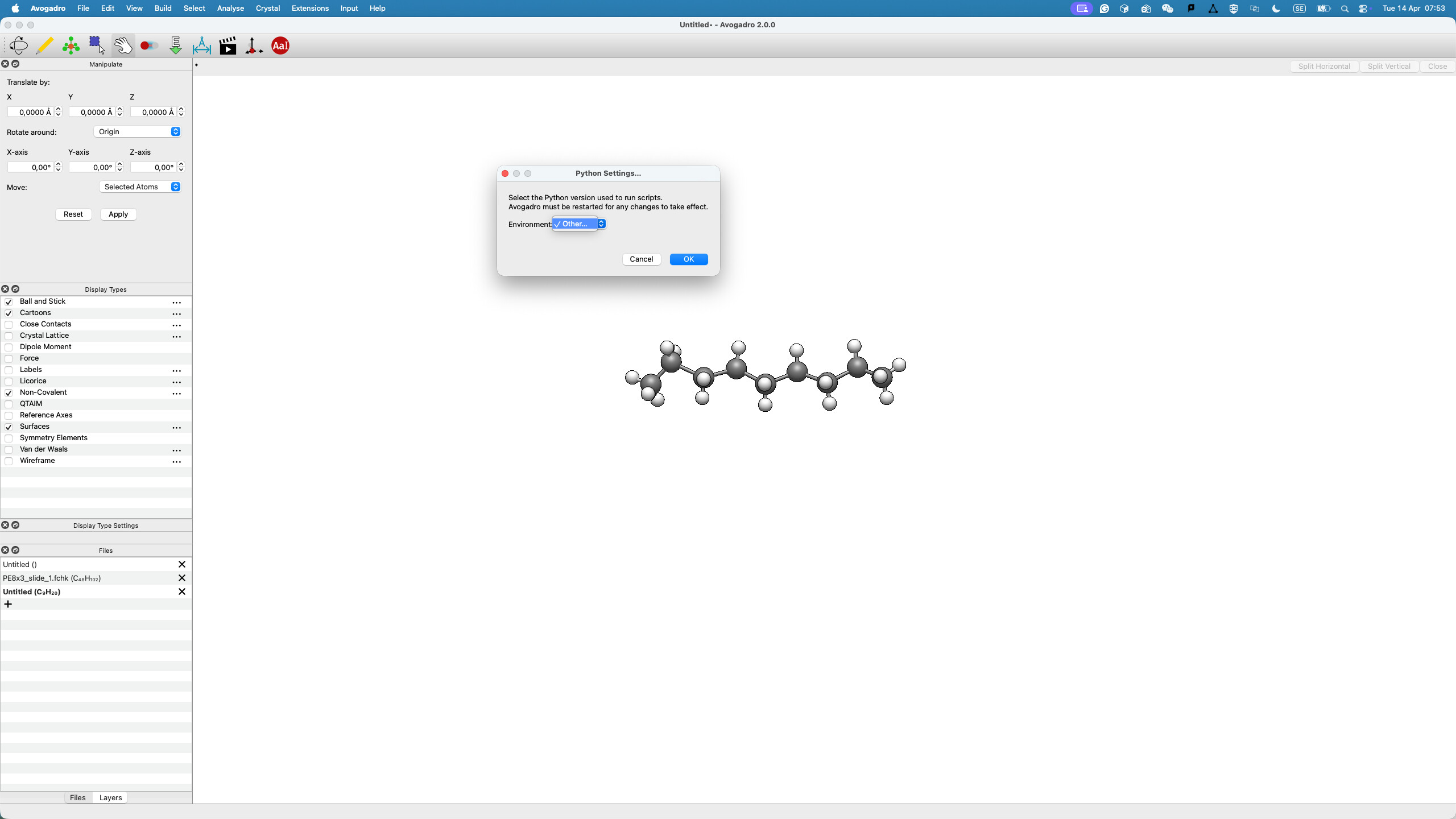 But the other functions just don’t respond. To test the function, I drag one of the carbon atoms from its original position so that, if optimisation occurs, I can see it clearly. Only the geometry optimisation under Open Babel and the one under Extensions worked.