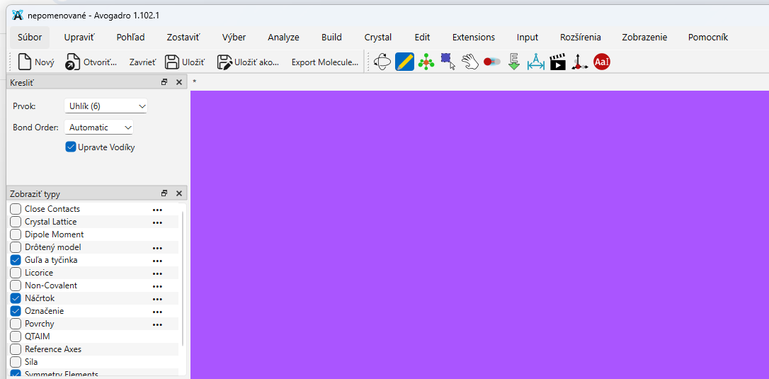 I downloaded Avogadro 2 on my new work computer (I had the known problem of A1 with selecting atoms due to some miscompatible drivers, so I’m running Avogadro-nigthly_build_250118Win64 on Win11 24H2). Because it’s a work PC, the system language is Czech and I can’t easily change it.