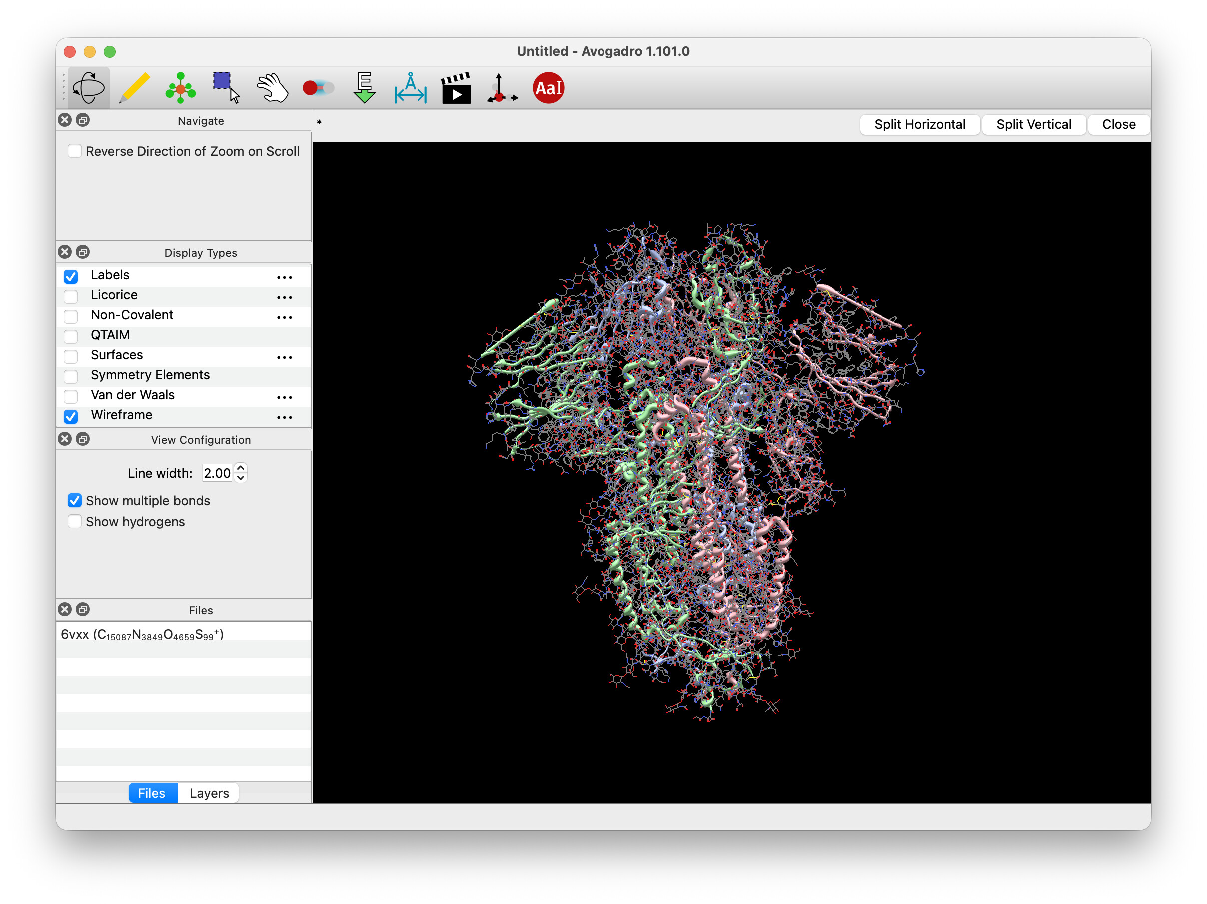 (i.e. COVID spike protein) with ball-and-stick turned off, but wireframe and cartoons turned on.